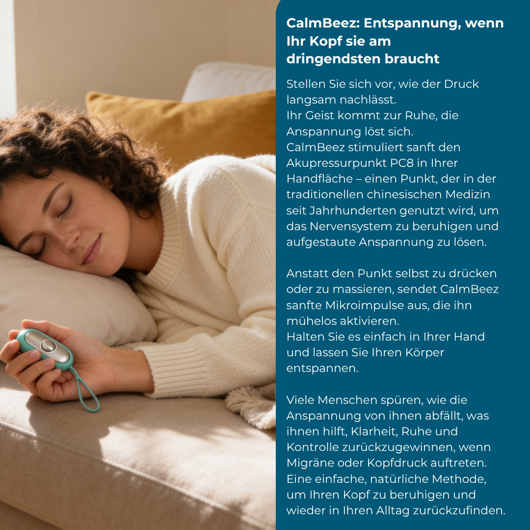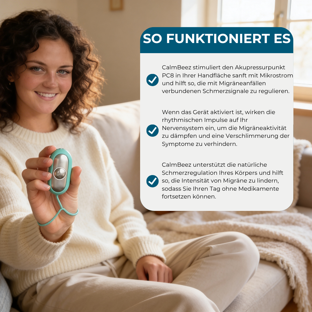Calmbeez stimuliert mit sanften Mikroströmen einen wichtigen Druckpunkt in der Hand, der mit dem Nervensystem in Verbindung steht. Dies hilft dabei, Schmerzsignale zu regulieren und Migräneaktivitäten zu lindern, sodass Ihr Körper die Intensität eines Anfalls auf natürliche Weise verringern kann.