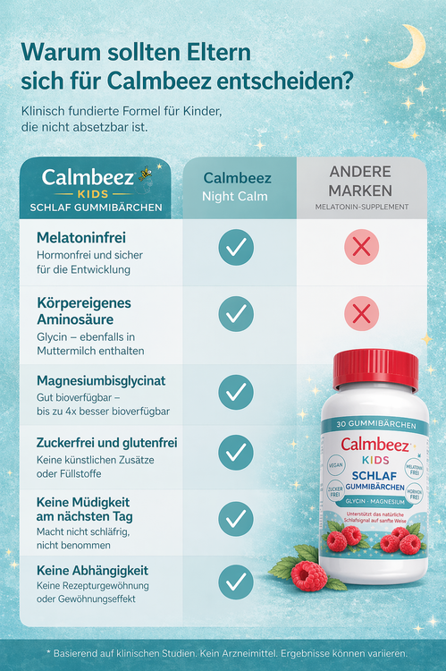 Calmbeez NightCalm® ist eine klinisch fundierte Schlafformel für Kinder, entwickelt auf Grundlage umfassender Forschung zur Physiologie des kindlichen Schlafs. NightCalm kombiniert Glycin und Magnesiumbisglycinat – zwei körpereigene Bausteine, die zusammenwirken, um den natürlichen Schlafprozess Ihres Kindes zu aktivieren, ohne Hormone und ohne künstliche Zusätze.